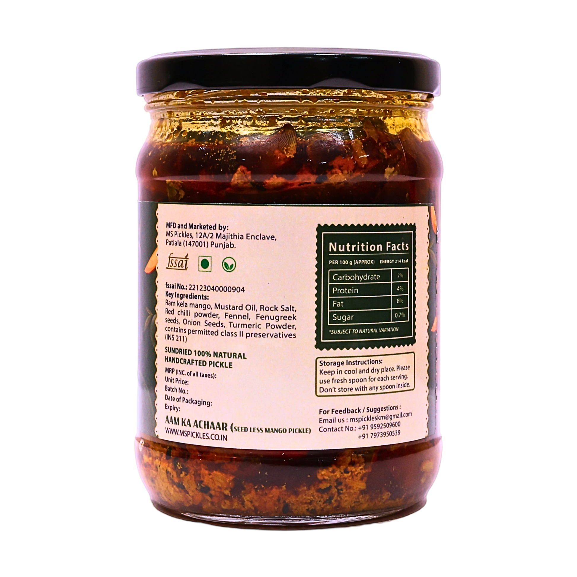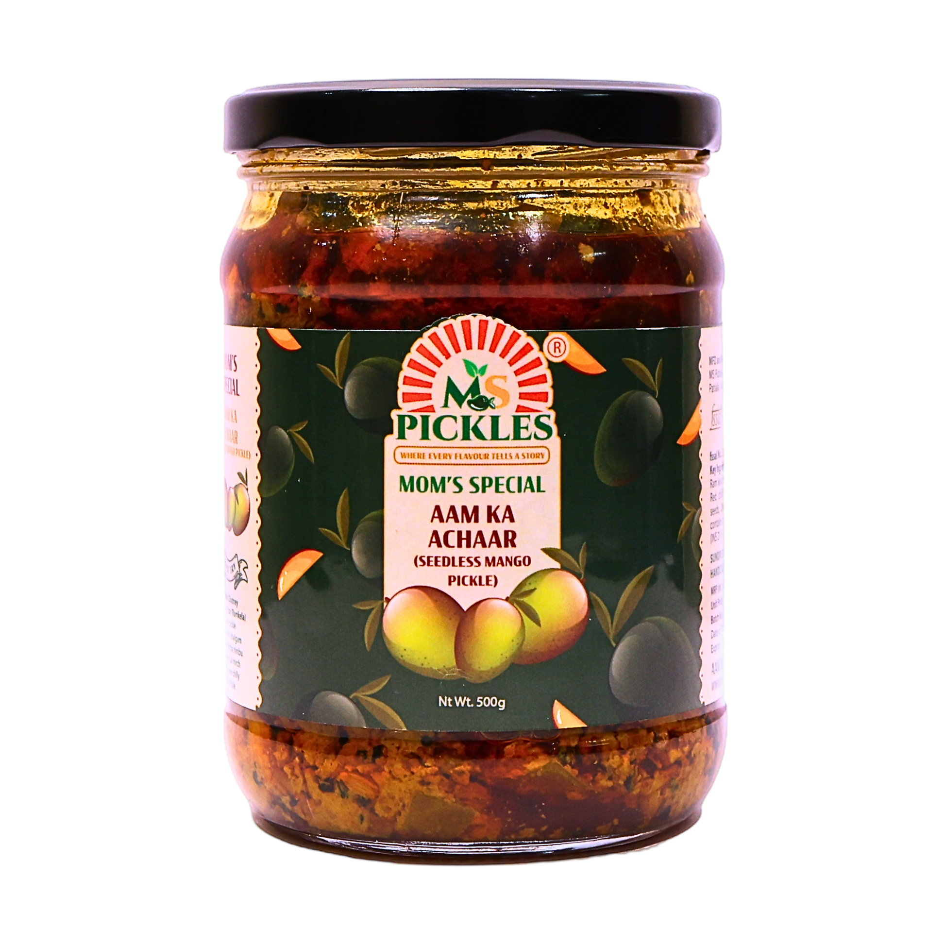 Bring home the real taste of summer with our homemade Aam Ka Achaar (Seedless). We use hand‑picked ram kela mangoes, cut into perfect bite‑sized pieces—no seeds to fuss with! Each piece soaks up a traditional blend of spices and mustard oil, giving you that classic tangy‑spicy kick you love.